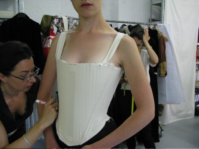 Für eine Persönlichkeit aristokratischer Abstammung fertigen wir derzeit ein in seiner Einfachheit bestechendes Korsett im Still des späten XVI Jahrhunderts. Während die senkrechte Anordnung der vielen Korsettstäbe die Beherrchung der Leidenschaft symbolisiert, weist die zarte Handstickerei (Motiv und Ausführung – Beata Sievi) aus die verborgene Sehnsüchte der Trägerin.