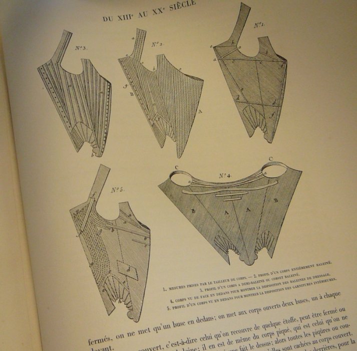 Written some years after the heyday of corsetry by Fernand Libron, president of the Chambre Syndicale des Fabricants de Corsets, and Henri Clouzot, conservateur of the Musee Galliera (better known today as the Musee la Mode et du Costume), this monumental costume book pays special tribute to Ernest Leoty’s very scarce Le Corset a Traverse les Ages (1893), which includes detailed cutting paterns and technical information for the tailor who specializes in making corsets. “A corset is somewhat similar to an umbrella in its construction. When the umbrella is raised, the fabric tautens. The ribs are reinforced with metal tips, to which the fabric of the umbrella is sewn. These tips hold the fabric in a tautened condition while the umbrella is in use. It is the same with a corset” (O.Y. Dalziel). Text in French. Accompanied by 15 loose engravings, listed in the index of illustrations under the heading “Album.”