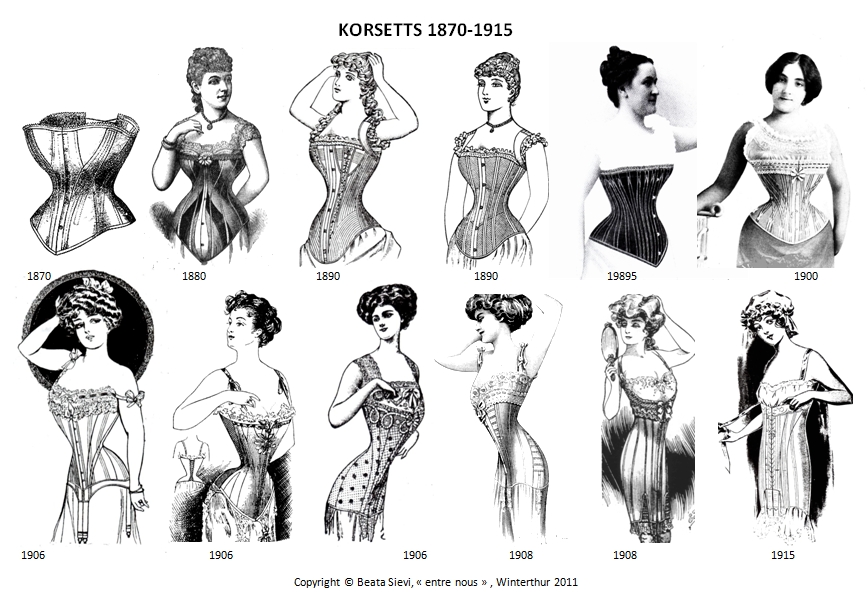 Vielen Menschen ist es heute gar nicht bewusst, wie vielfältig die Korsettformen in der Modegeschichte waren. Seit dem 16. Jh. bis ins 20. Jh hat sich das Ideal weiblicher Schönheit mehrmals geändert und demensprechend auch das Korsett. Recherchen zu diesem Thema bilden einen wesentlichen Teil meiner Arbeit. In der nur kurzen Zeitspanne von 1870 bis 1910 beobachten wir 12 verschiednen Schnittformen!