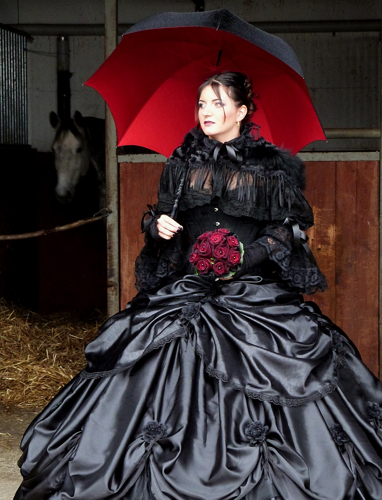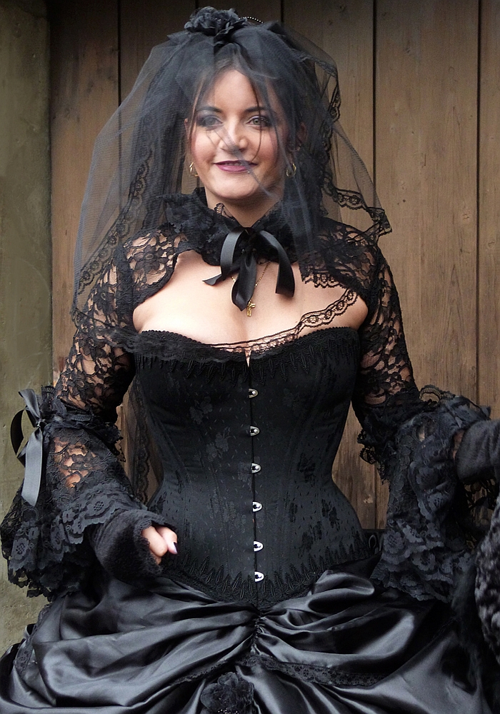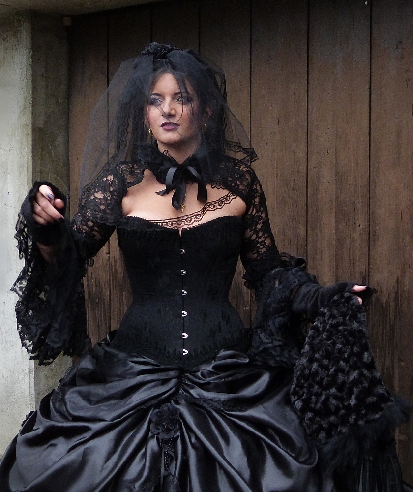 Die Gothic-Szene gilt als ästhetisch orientierte retrospektive Kultur mit einer enormen Bandbreite an modischen Formen. Es war für mich ein besonderes Erlebniss die Hochzeitsvorbereitungen von Marisa, einer grossen Gothic-Liebhaberin, mitzuerleben. Marisa hat für Ihre Hochzeit das schwarze prêt-à-porter Korsett von « entre nous » gewählt und war nicht nur über das Design sondern auch über den Tragkomfort des Korsetts begeistert. Den Jupe und alle Accessoires hat Marisa selbst zusammengestellt.