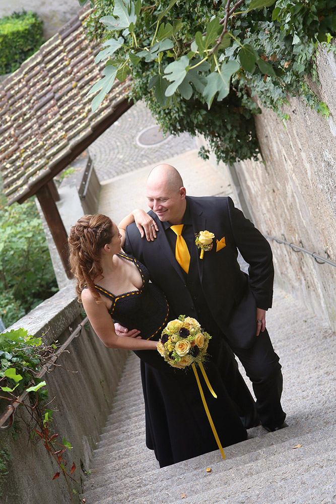 Die schwere Guipure-Spitze, inklusive zarten Bordüren, aus denen das Hochzeits-Bustier angefertigt wurde, stammen von dem Berühmten Spitzen-Produzenten, Forster Rohner in St. Gallen. In die Bordüre, welche Saum und Träger ziert, wurden von Hand gefertigte gelbe Satinbänder eingeflochten. Die Gesamtarbeit am Bustier betrug 35 Stunden. Der lange, schwarze Jupe der die weiblichen Kurven zusätzlich betont, gehört zu den beliebtesten entre-nous-Modellen und verbindet sich mit dem schwarzen Bustier zu einer aparten Einheit.