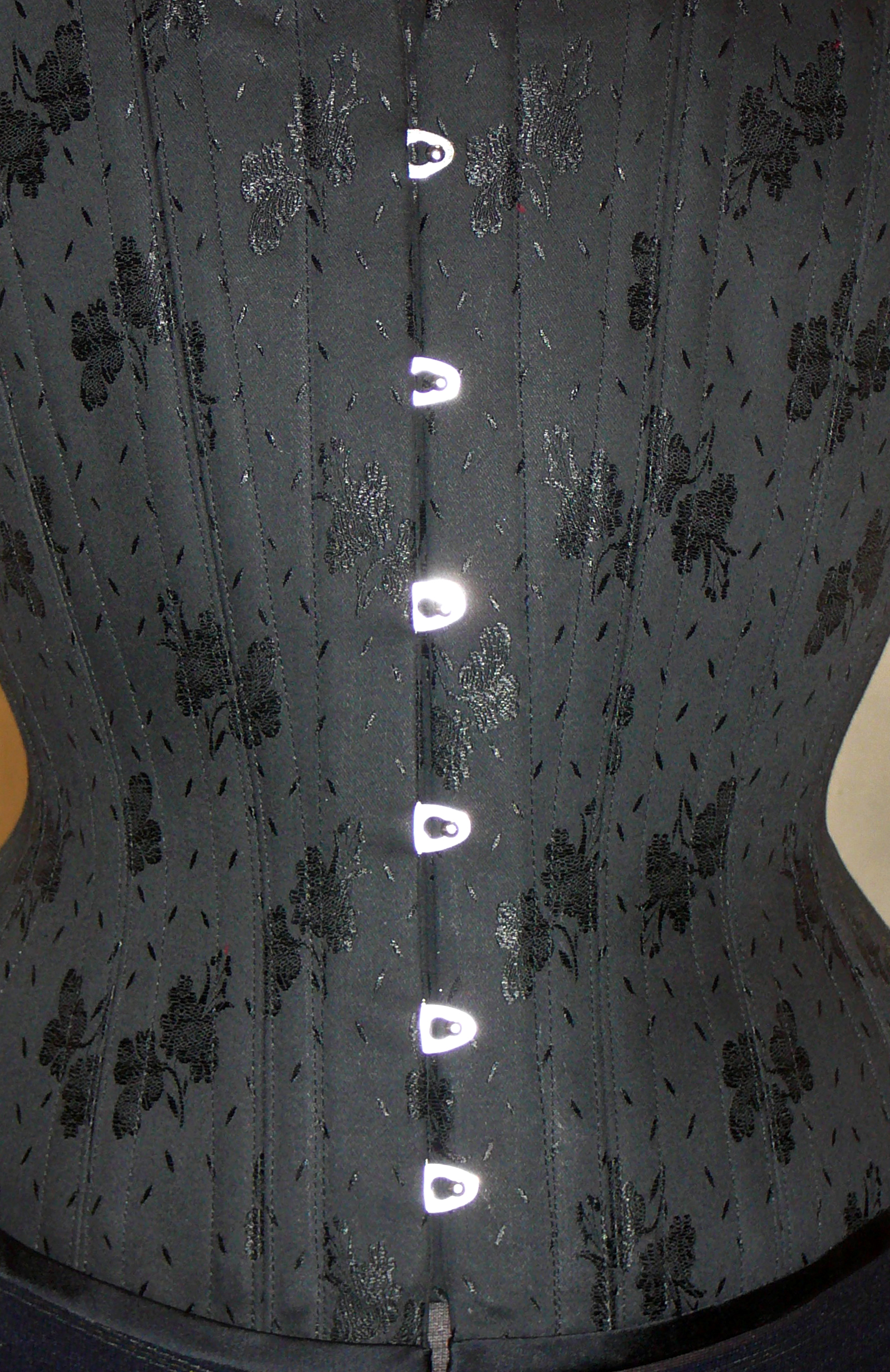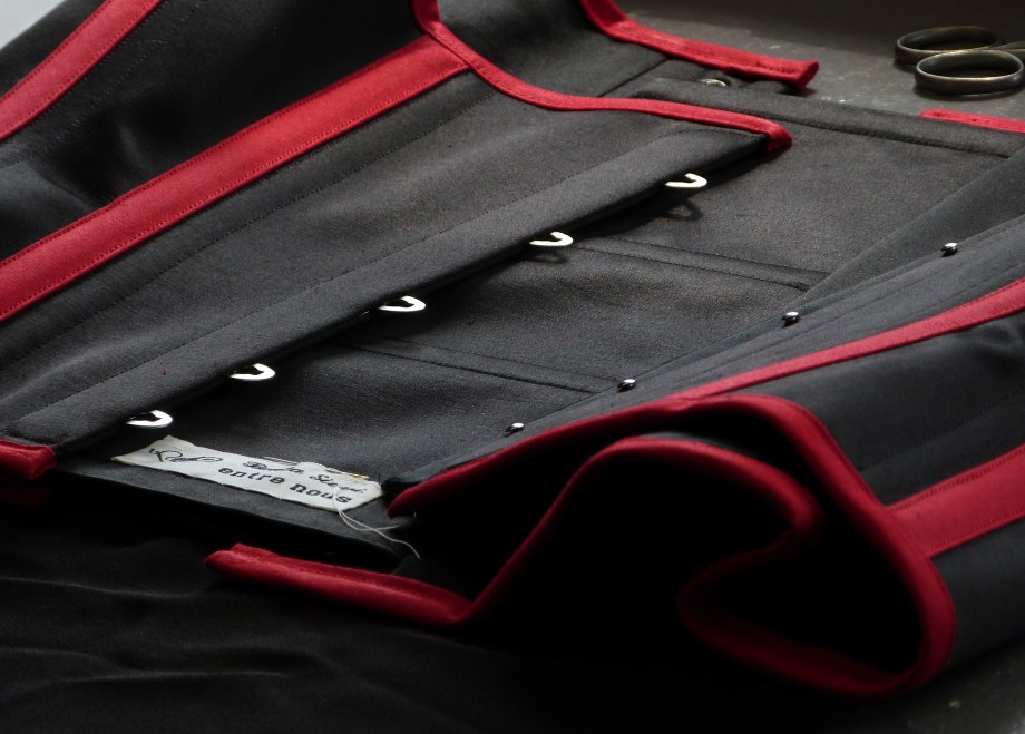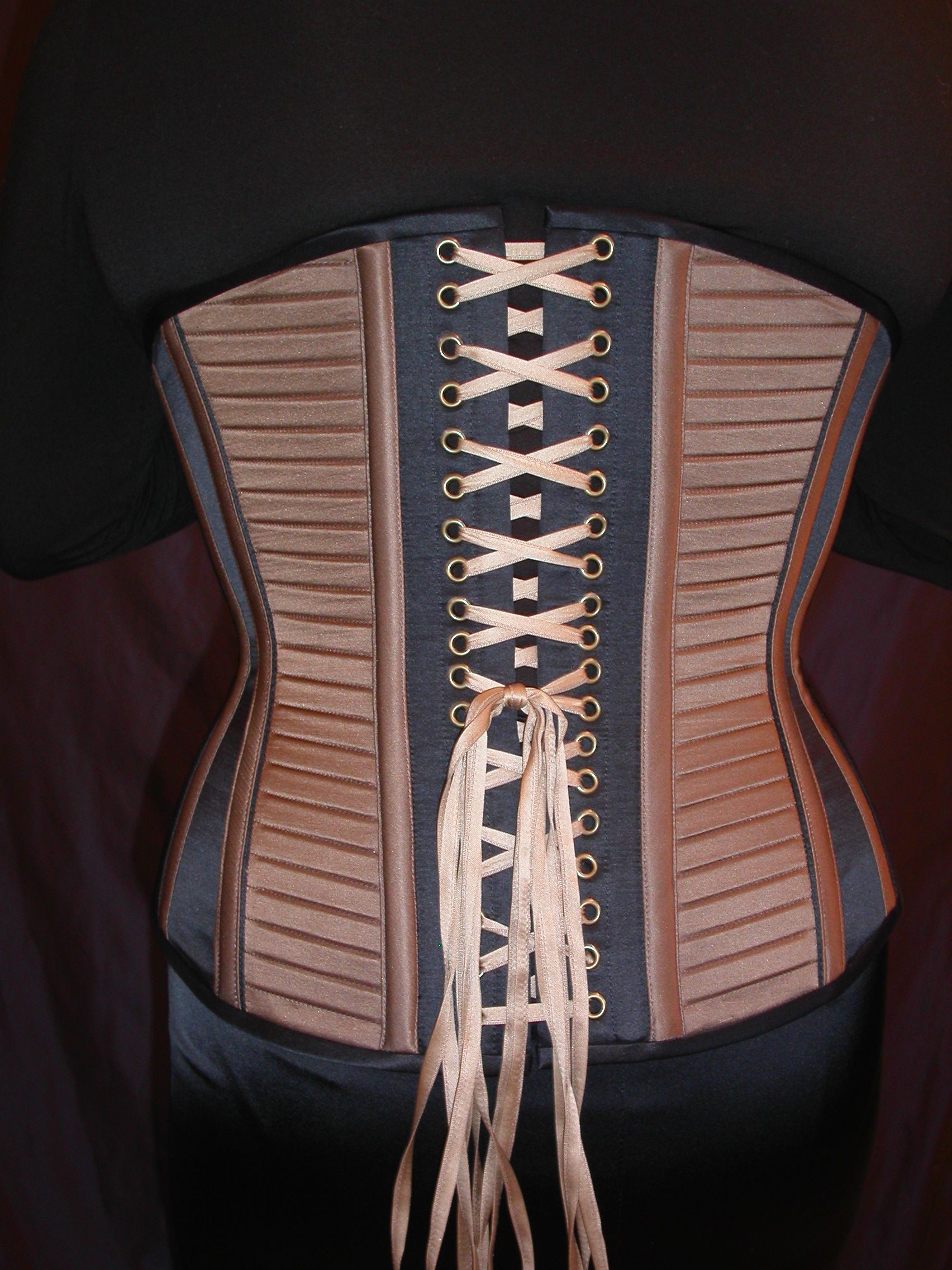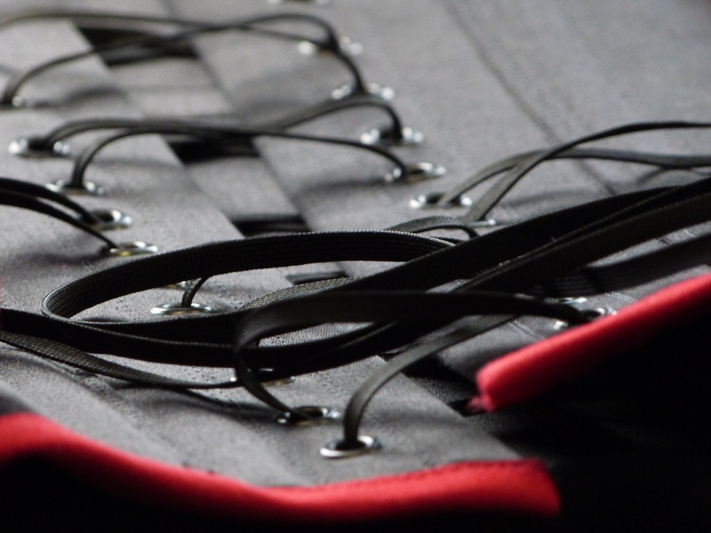 Da es anfangs 2000 zwar einige wenige Internet-Foren für Korsettträger gab, aber keine für den Austausch von Fachpersonen, die Korsetts anfertigen – und die wenigen Korsettmacher*innen, die es in Europa gab ihr Wissen streng behüteten, blieb mir nur der Weg der Autodidaktik übrig. In Bezug auf Männerkorsetts war er schwierig, weil es in den Museen, deren Spezialsammlungen ich besuchte, um historische Korsetts zu studieren, keine Herrenkorsetts zu sehen gab. Geleitet durch mein ausgeprägtes analytisches Denken und meinen handwerklichen Perfektionismus nahm ich also learning by burning in Kauf. 2001 fertigte ein sehr enges Korsett aus Rips Stoff und Leder an, das besonders schön gestaltet und – zum ersten Mal – den Ansprüchen des Kunden vollkommen zu entsprechen schien. Einige Wochen nach der Lieferung rief mich der Kunde an, mit der Nachricht, dass eine Naht unerwartet gerissen ist, als er niessen musste. Es lag sicher nicht an der Fadenstärke, da ich von Anfang an besonders starke Fäden benutzte. Das Problem war die Art und Weise, wie die Tunnel für die Korsett-Stäbe angebracht waren; schön für das Auge, boten sie nicht genügend Stütze für die Starke Spannung, die im tight lacing Korsett auf die Nähte ausgeübt wird. Dies liess sich nur ändern indem ich das ganze Korsett in einer neuen Technik noch einmal anfertigte!