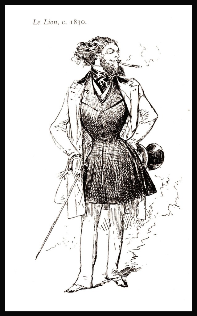 In den ersten Jahrzehnten des 19. Jh. war die neue Gesellschaftsschicht der Bürgerlichen darauf bedacht, ihrem neuen politischen Status auch in ihrer Kleidung Ausdruck zu verleihen. Dazu gehörte vor allem die Farbe Schwarz – ein hoher schwarzer Hut, lange schwarze Röhrenhosen, Frackrock aus schwarzem Tuch. Nur die Westen durften bunt oder kariert, die Brust leicht wattiert, und die Taille betont sein. Auch wenn aus heutiger Sicht diese Mode durchaus körperbetont und verspielt erscheint, stellte sie in Augen der Männer, die sich noch an die höfische Tradition erinnern konnten, eine lieblose Zwecktracht dar, die alle gesellschaftlichen Unterschiede nivellierte. Aus dem Aufbegehren gegen diese modische Gleichmachung entstand die bunte und extravagante Dandy Mode – ein Männerideal, das die höfische Tradition wieder aufleben liess. Der modische Auftritt eines Dandys erforderte einen farbigen enggeschnittenen Anzug, eine enge Kniehose, ein weisses Hemd, kunstvoll umgelegte gestärkte Halstücher und Krawatten und nicht selten ein Korsett, damit er überhaupt in den stark taillierten Frack schlüpfen konnte. Die erste Generation von Dandys sorgte in London und Paris für Aufsehen und forderte den Spott der Karikaturisten heraus.