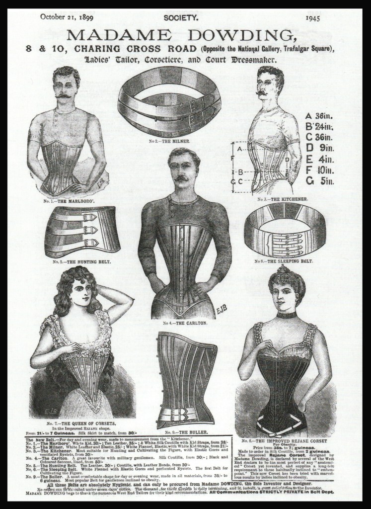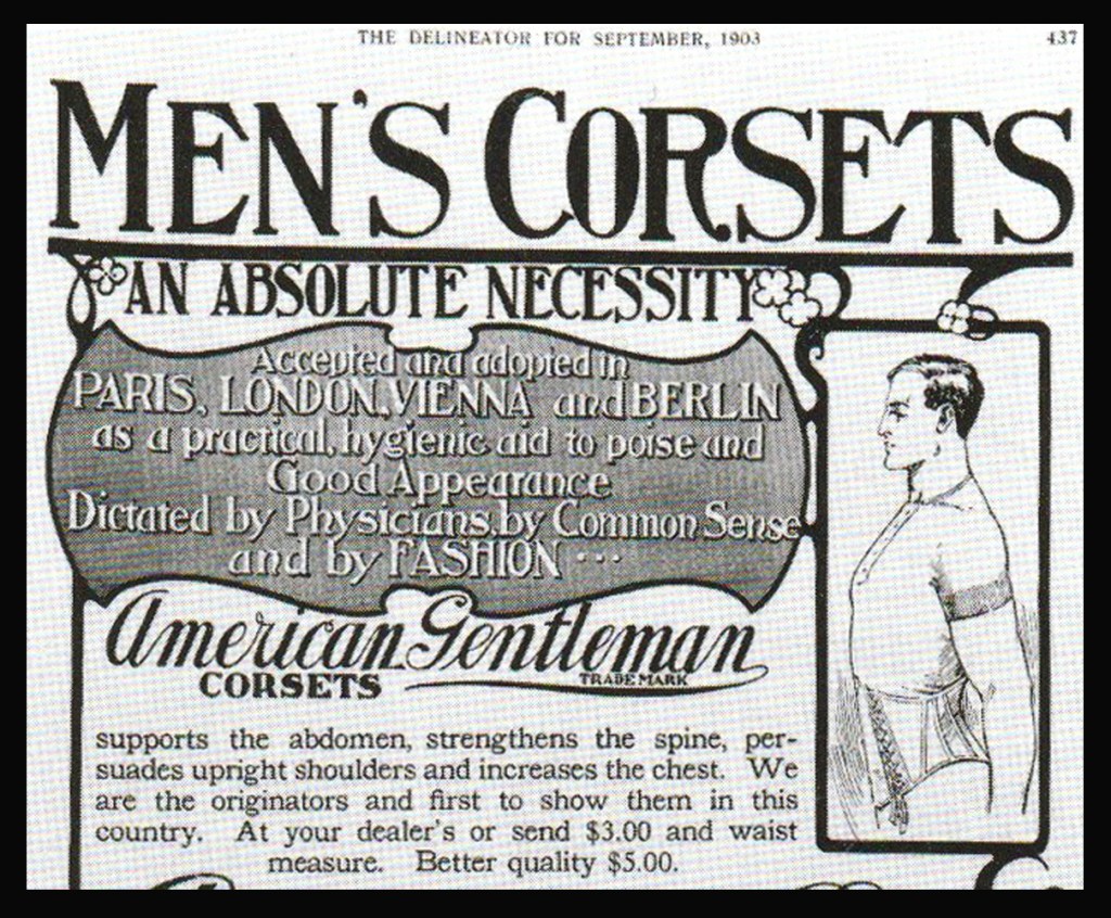 Auch wenn viele darüber staunen, dass in den 20 Jahren meiner Tätigkeit als Corsetière ein Viertel meiner Klientele Männer waren, ist das Tragen des Korsetts von Männern kein neues Phänomen. Modeforscherin Valerie Steele zitiert in ihrem Werk «The Corset» einige Dokumente, die beweisen, dass diese Praxis im 19 Jh. im Militär, insbesondere in der Kavallerie, verbreitet war. Auch von den Reitsportlern und von fettleibigen Herren wurde das Accessoire gern als Stütze benützt, was sich in der Werbung von damals widerspiegelt. Einige Korsettmanufakturen warben mit Bildern und einschlägigen Slogans direkt um die männliche Kundschaft.