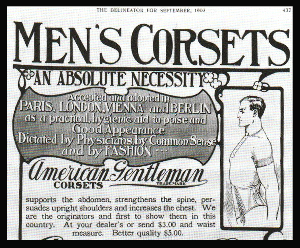 Laut Valerie Steele, die zu dem Thema der Männerkorsetts intensiv recherchierte, begann sich die Männermode nach 1850 stark zu verändern. Mit der Erweiterung der Anzüge, die keine Betonung der Brust und Taille mehr vorsahen, entfiel auch für die Männer der Grund oder nur Vorwand, ein Korsett zu tragen. Die Bourgeoisie behauptete, dass es der Männlichkeit widerspricht, so viel über Mode nachzudenken. Der gewöhnliche Bürger wurde nach 1850 endgültig grau und der Ausdruck der Individualität reduzierte sich auf die Wahl der Krawatte oder einer Blume im Knopfloch. Die Tatsache, dass sich in dieser Zeit dennoch einige Betriebe weiterhin in der Anfertigung von Herrenkorsetts spezialisierten und dies in ihrer Werbung deutlich machten, lässt laut Steele vermuten, dass es gegen Ende des 19 Jh. an männlichen Korsett Enthusiasten und Crossdresser nicht fehlte aber sie mussten ihre Vorliebe fortan geheim halten.