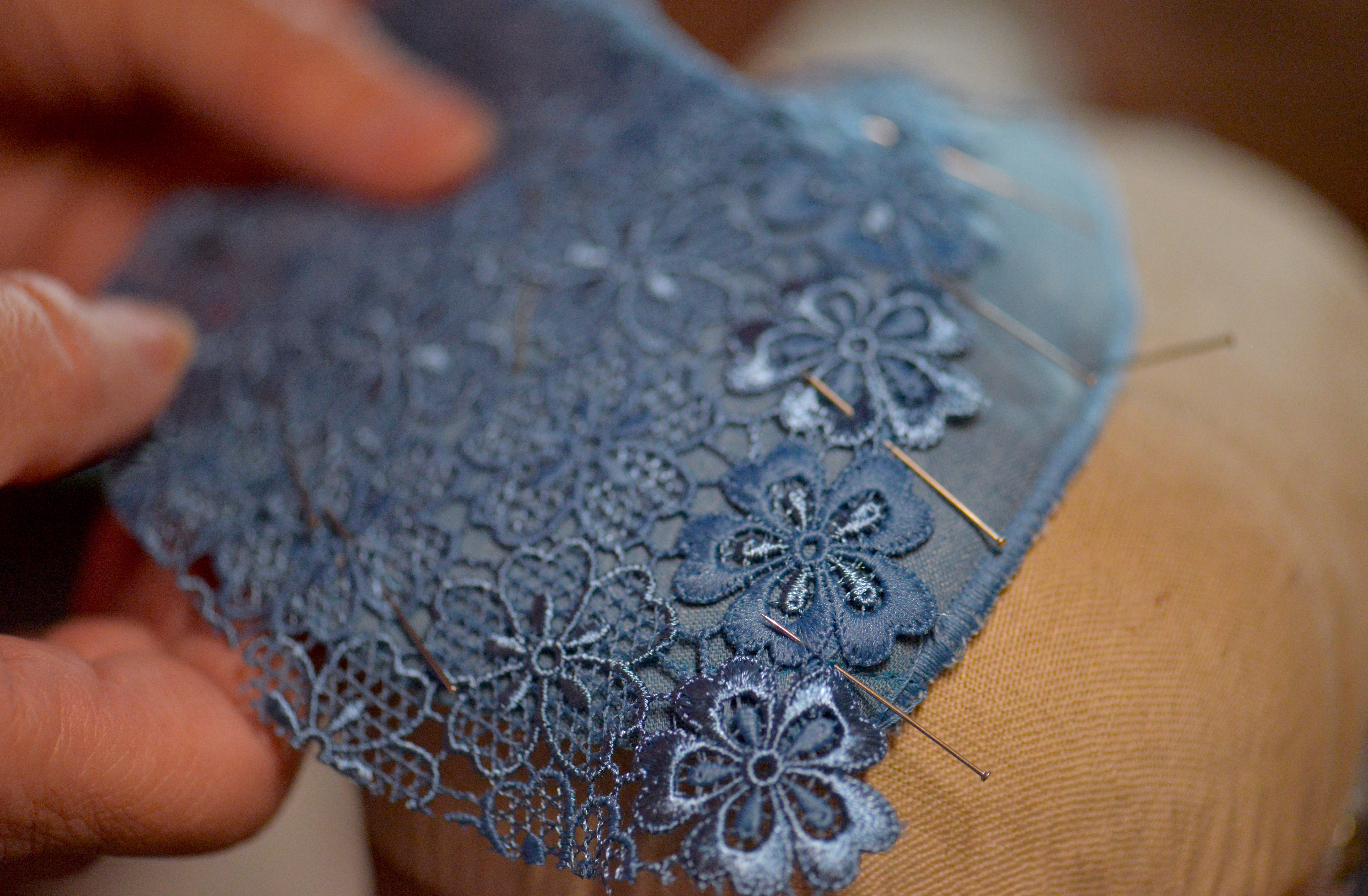 Beim Schneiden der Spitze muss man äusserst behutsam vorgehen, um das gewünschte Material exakt zu schneiden und zu vermeiden, dass die Spitze beschädigt wird. Das Nähen der oft sehr dicken Guipure-Spitze kann schwierig sein und einige Arbeiten können nur von Hand ausgeführt werden. In meinen Kursen wird die wertvolle St.Gallerspitze in Form von langen Bahnen, sogenannten Gallons, verwendet und mit anderen Materialien wie Tüll und Seidensatin kombiniert, um ein elegantes und ansprechendes Design zu schaffen. Es ist von essenzieller Bedeutung, dass die Kombination der Materialien harmonisch wirkt und die Spitze nicht überladen oder verdeckt wird. Auch die Farbauswahl spielt eine tragende Rolle. Die Farben der Spitze müssen mit denen der anderen Materialien abgeglichen werden, um sicherzustellen, dass sie gut zueinander passen.