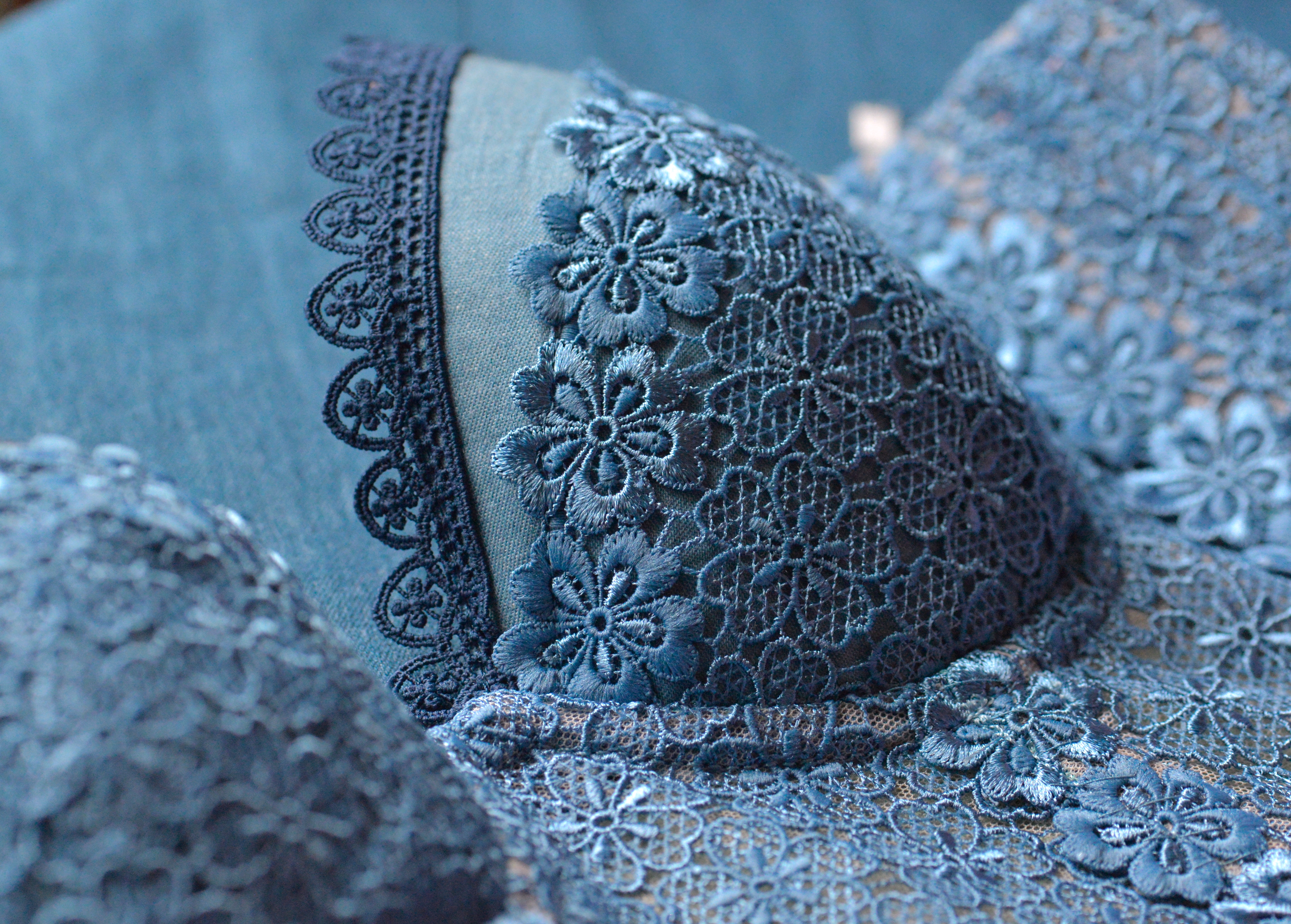 Die andere Kursteilnehmerin, Leiterin eines Modeateliers an der Modeschule Giessen, hat sich für eine schlichte Variante mit dunkelblauen Spitzenbordüren-Verzierungen entschieden. Sie besuchte den Kurs, um ihr Fachwissen zu erweitern und hofft, das erworbene Wissen gelegentlich an ihre begabte Schüler*innen weitergeben zu können.