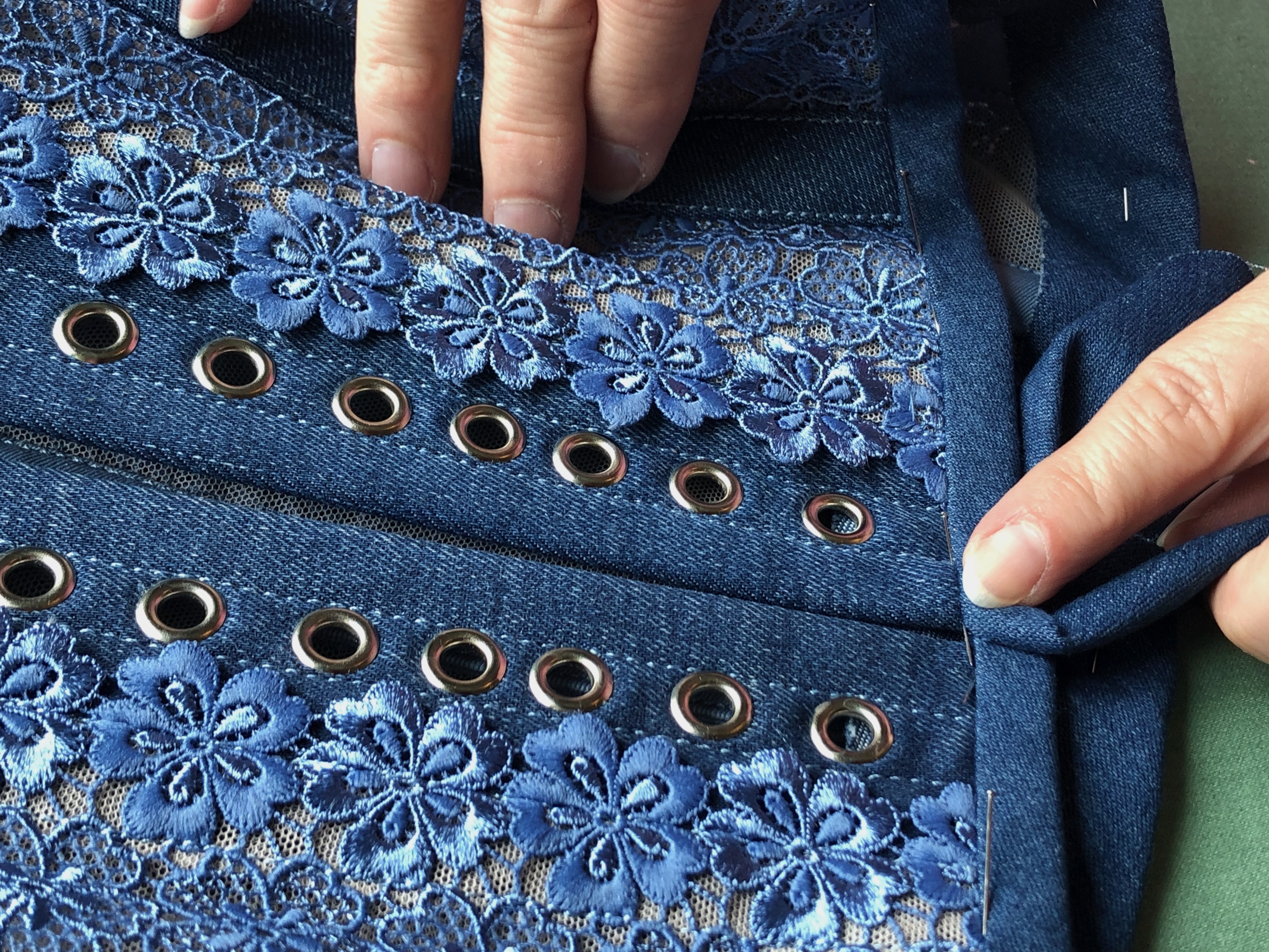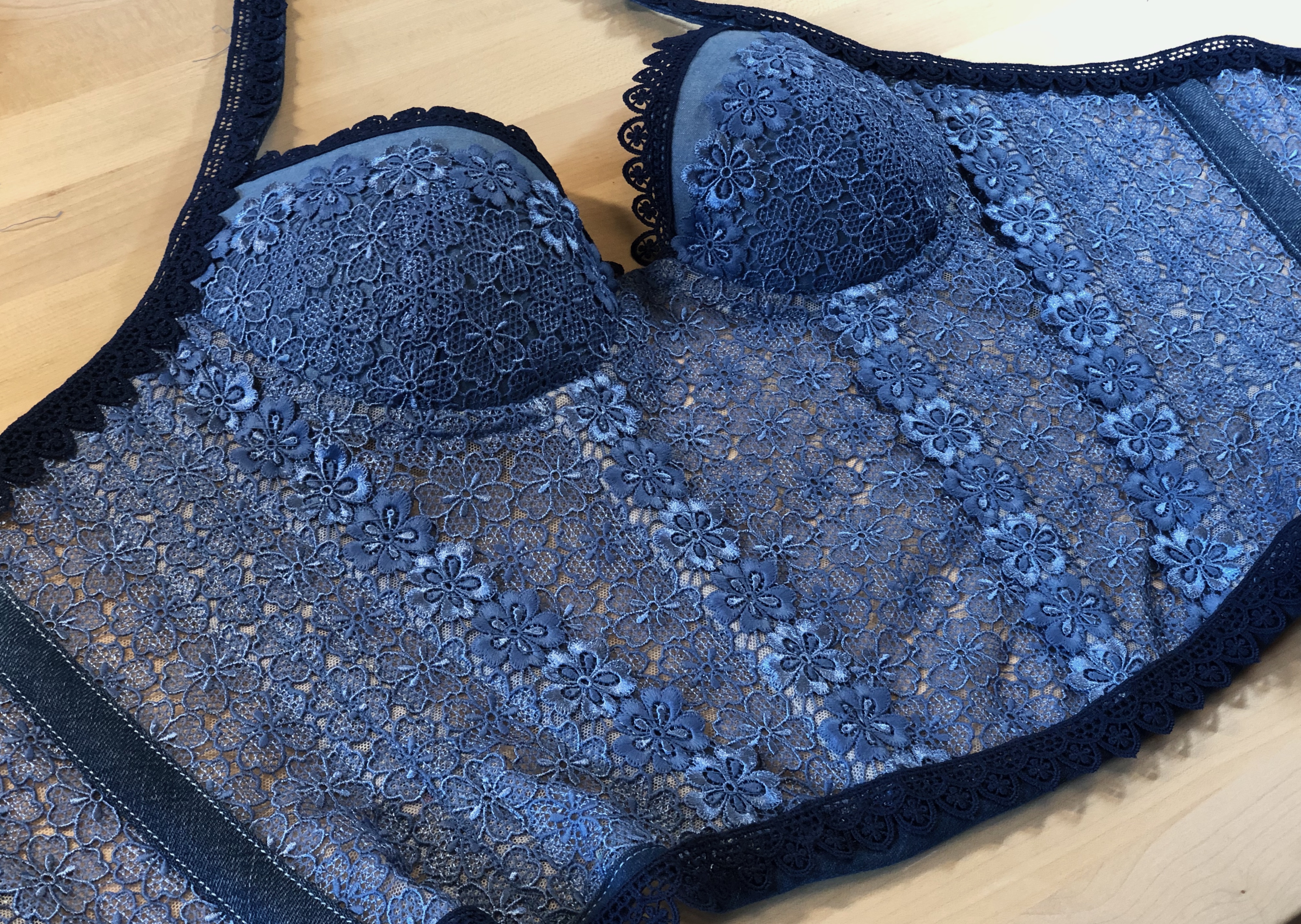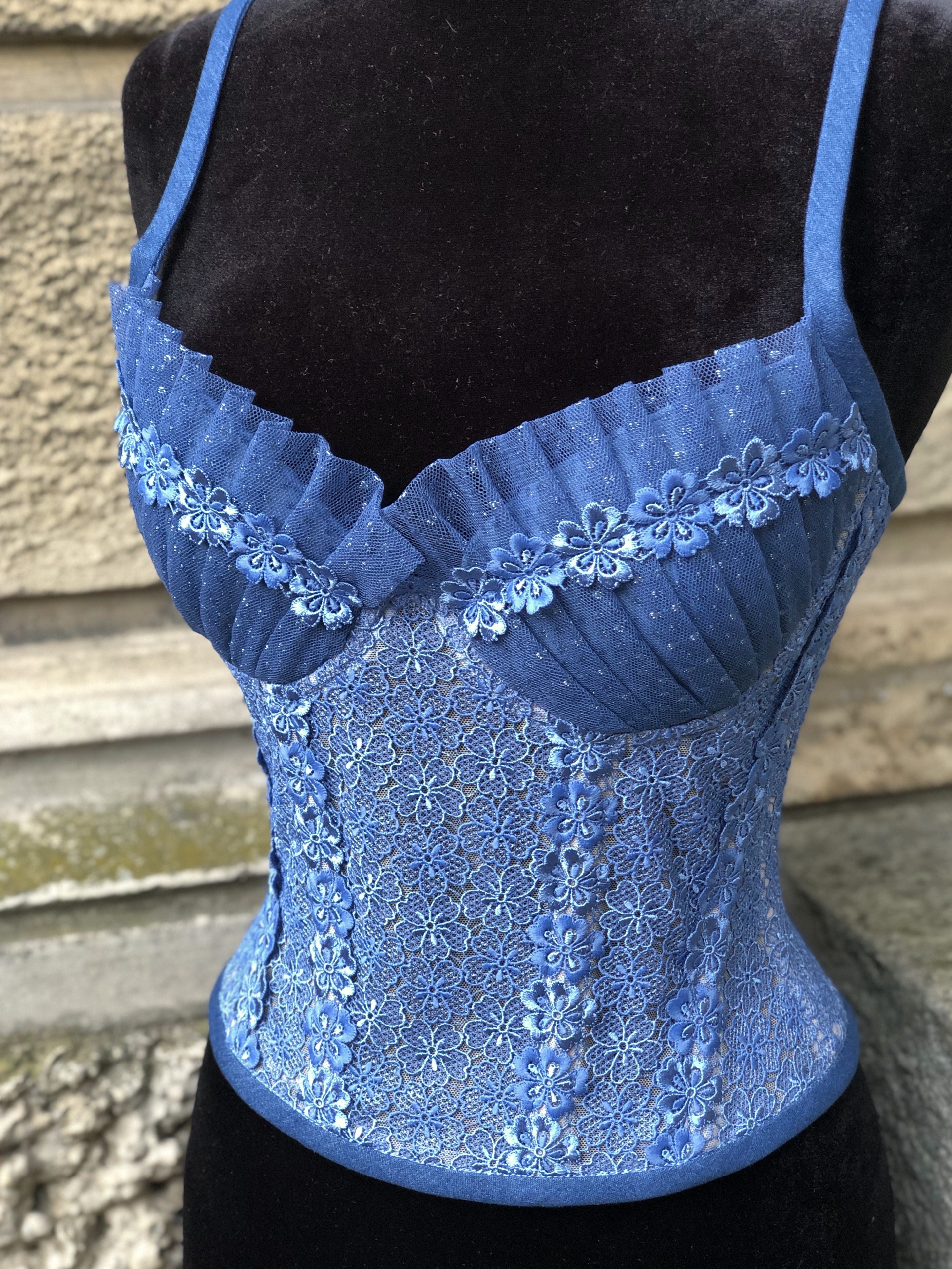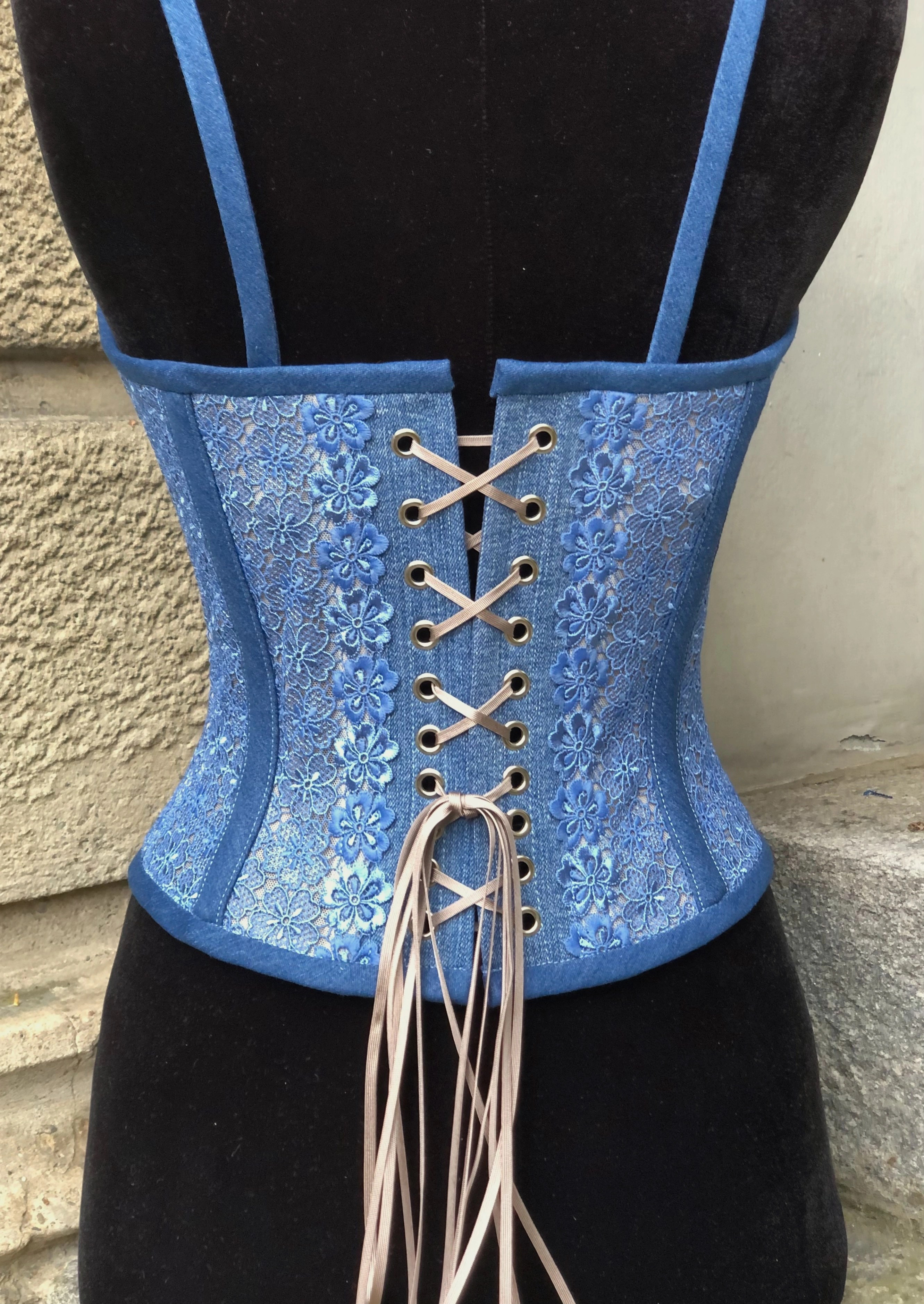 In meinem letzten Kurs habe ich den Kursteilnehmerinnen eine romantische Spitze mit Blumenmotiven in Blau vorgeschlagen, die in Kombination mit gebrauchtem Jeansstoff und Glitzertüll ein hervorragendes Ergebnis erzielte. Obgleich in meinem Kurs viele Vorgaben gemacht werden, besteht bei der Gestaltung der Bustier-Cups die Möglichkeit für Kreativität und individuelle Gestaltung. So hat eine der Teilnehmerinnen, die Inhaberin eines Ateliers für Abend- und Hochzeitsmode, die Chance genutzt, für die Cups eine aufwendige Drapierung aus glitzerndem Tüll zu gestalten, sodass das Bustier in ihrem Atelier ausgestellt werden kann. Sie wird sicherlich Bestellungen für ähnliche Spitzenkorsetts für Hochzeiten oder festliche Anlässe erhalten.
