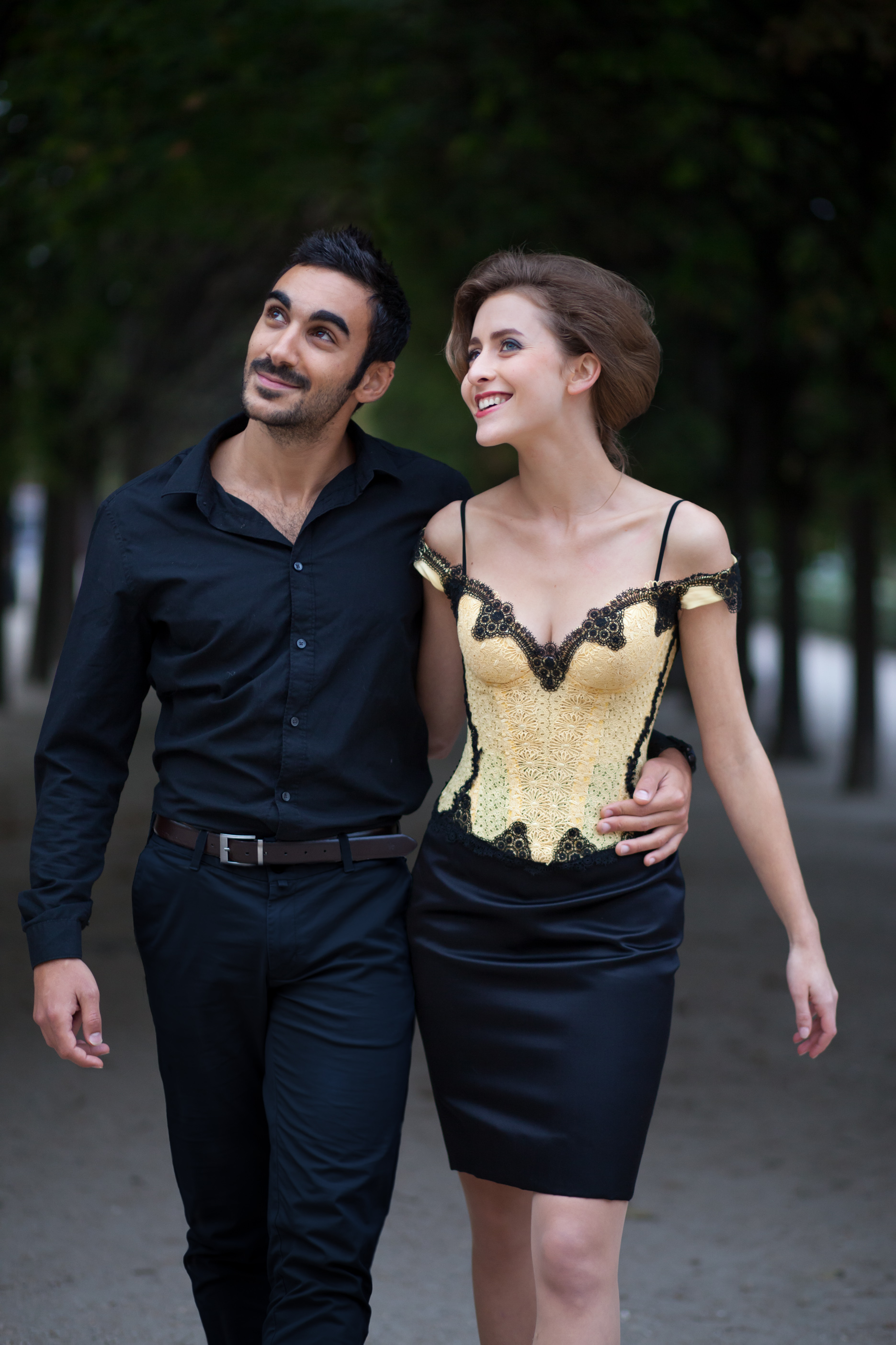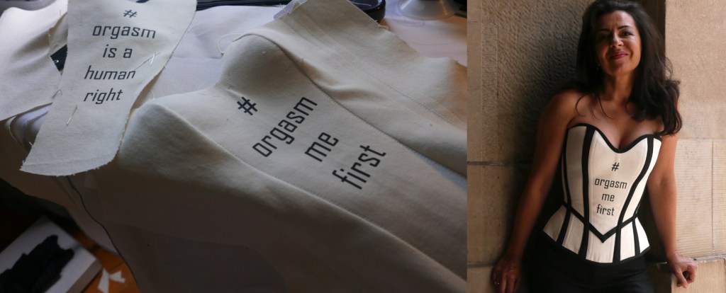 Da ich nicht nur Korsettdesignerin, sondern auch Psychologin bin, und den Wunsch verspüre, Frauen zu ermutigen, nicht nur an die Verführungskunst zu denken, sondern auch für ihre sinnlichen Bedürfnisse einzustehen, habe ich anschliessend ein Korsett mit der Anschrift «# Orgasm me first» kreiert. Es wurde ganz schlicht. Ich liess die auffordernde Anschrift in Schwarz auf einem weissen Leinenstoff aufdrucken. Als die Kreation vollendet war, realisierte ich, dass sie ein Abschluss einer Schaffensphase ist, die dem Thema der Verführung gewidmet war.