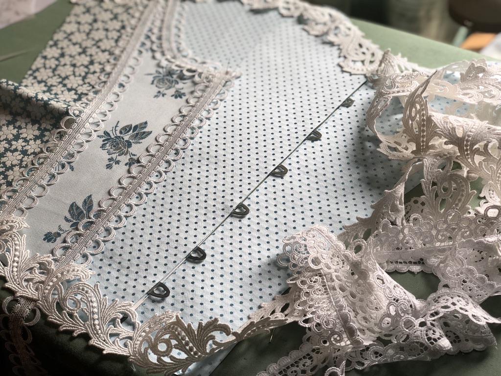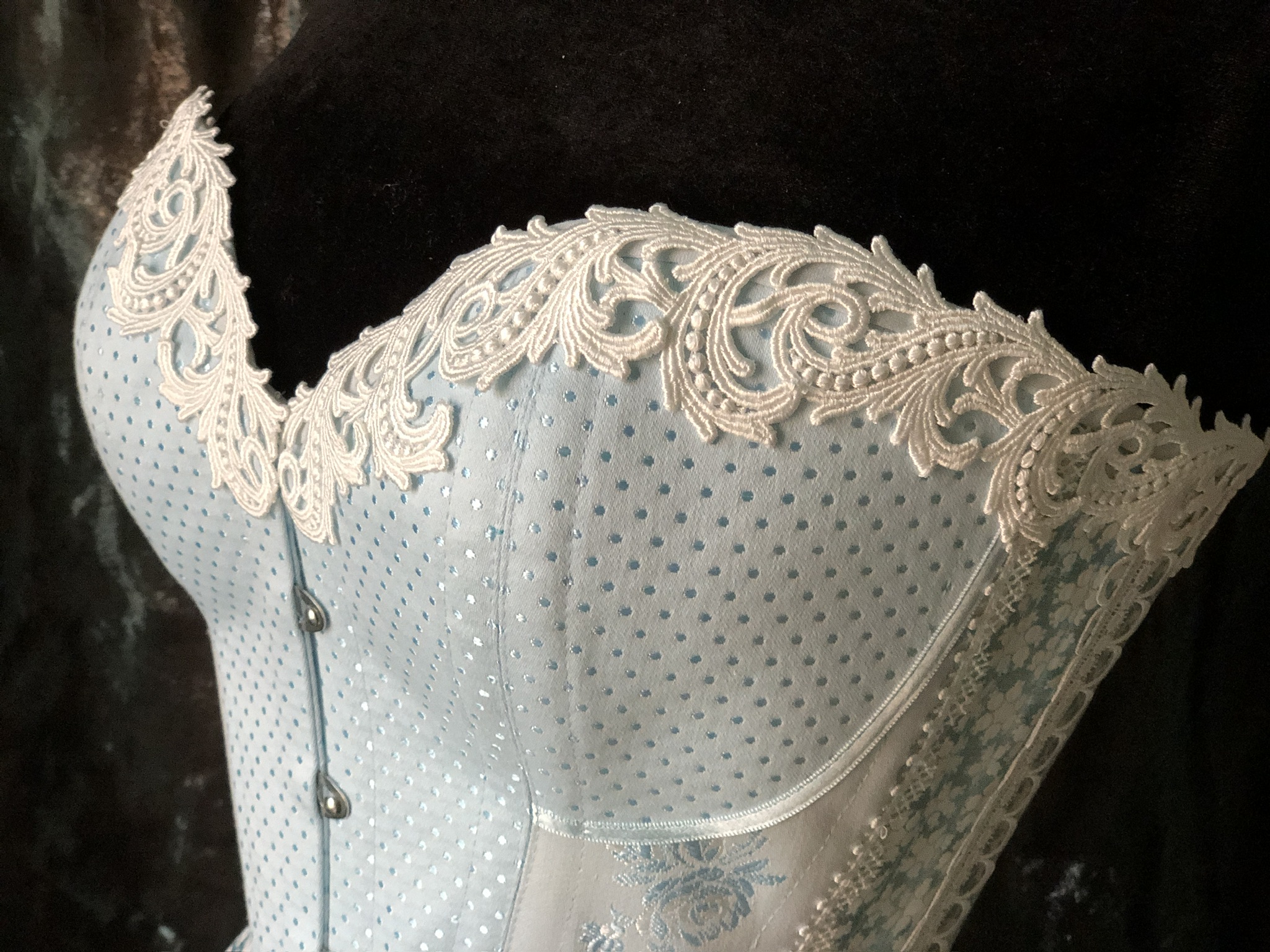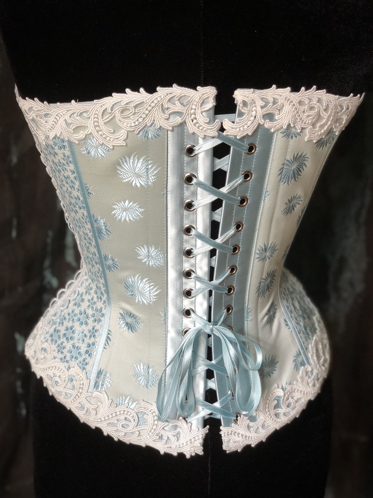 Nach der aufregenden Entdeckung und Rettung historischer Korsettstoffe im Februar dieses Jahres freue ich mich, nun mein neuestes Werk präsentieren zu können: das Korsett „L’heure blue“. Dieses Korsett, gefertigt aus den edelsten Stoffen der vergangenen Jahrhunderte, ist eine Hommage an die textile Geschichte und die Kunst der Korsetterie.