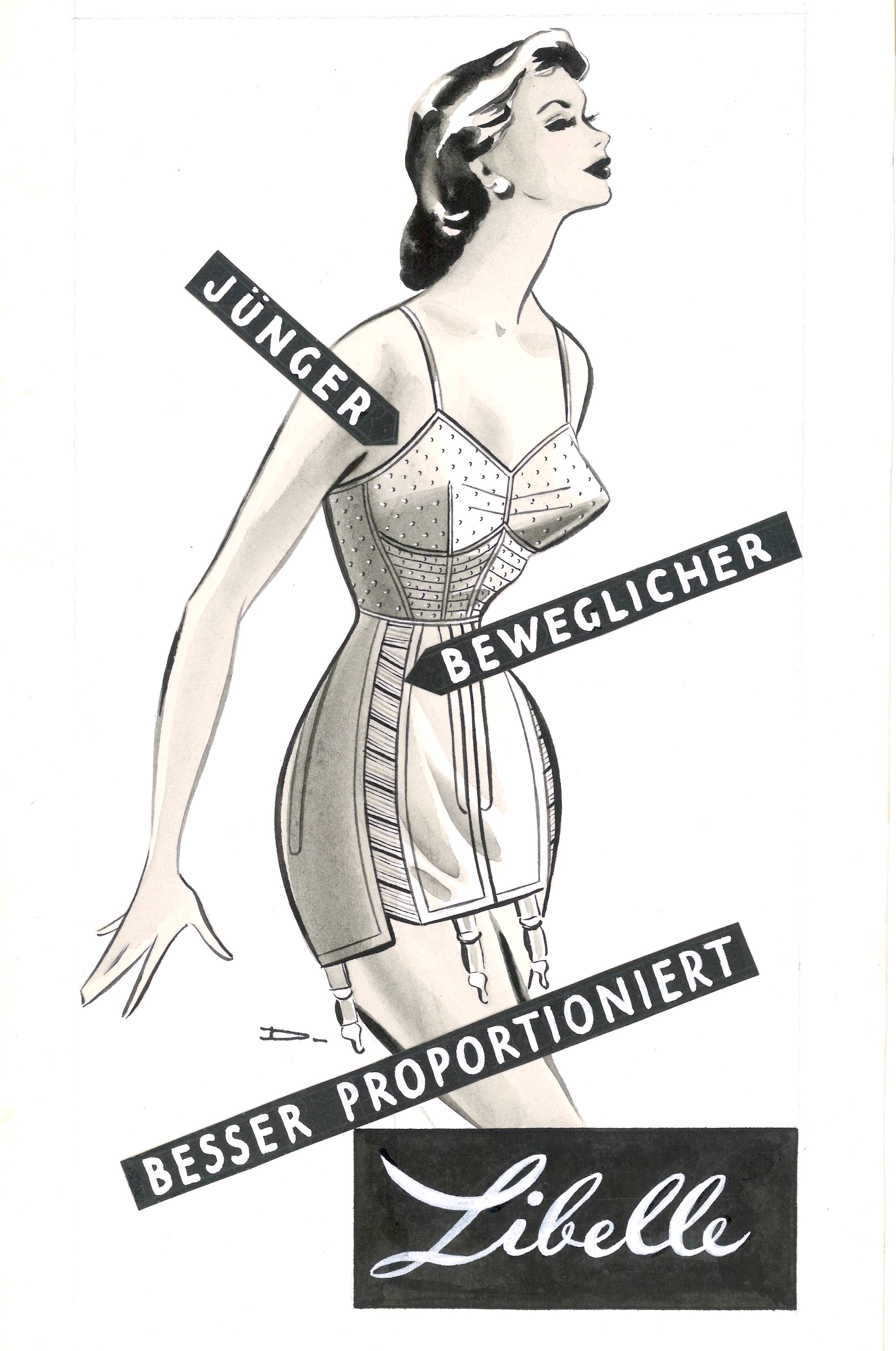 Ab den 1930er Jahren verschiebt sich der Fokus erneut. Die Brust kehrt zurück, zunächst subtil, dann zunehmend ins Zentrum der Silhouette. Technische Innovationen – Abnäher, elastische Materialien, erste BH-Bügel – ermöglichen gezielte Formgebung. Marken wie Kestos, Gotik oder Marie Lebigot verbinden handwerkliche Präzision mit ästhetischem Anspruch. Unterwäsche wird sichtbar mitgedacht, als architektonische Grundlage der Mode. Werbung inszeniert Haltung, Eleganz und gesellschaftliche Zugehörigkeit – der BH wird zum unsichtbaren, aber entscheidenden Akteur der Erscheinung.