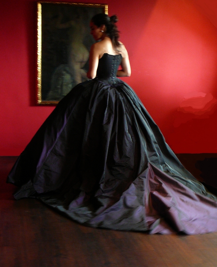 Die letzte Woche war sehr stark der Kreation „Madame Dubarry“ gewidmet – der kreative Prozess durfte heute in der zweiten Anprobe münden. Cindy hat zum ersten Mal das Kleid in ihrer ganzen Dimension, aus dem dunklen Taft angefertigt gesehen. Der Charme und Grazie meines neuen Mannequins begeisterten alle, die der Anprobe beiwohnen durften. Sie trägt die opulente robe à la Française als ob sie am französischen Hof zu Zeiten des Rokokos geboren wurde!