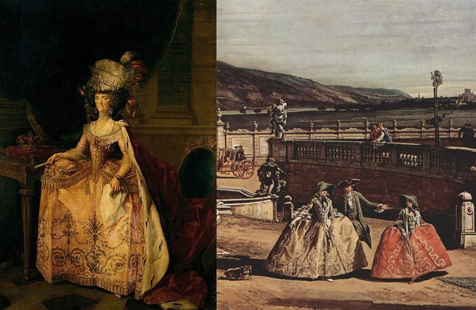 Dreieck und Rechteck: die Grundstruktur des höfischen Kleides spiegelt das Interesse der Aufklärung an geometrischen Grundformen. Das Mieder ist konisch geformt, während der Rock mit Hilfe vom Reifrock eine zunehmend rechteckige Form erhält. Diese Form der Jupe-Konstruktion hatte große Ähnlichkeit mit den damals auf Märkten verwendeten Hühnerkörben (d.h. kuppelförmigen Käfigen), daher der Name Panier (frz. „Korb“).